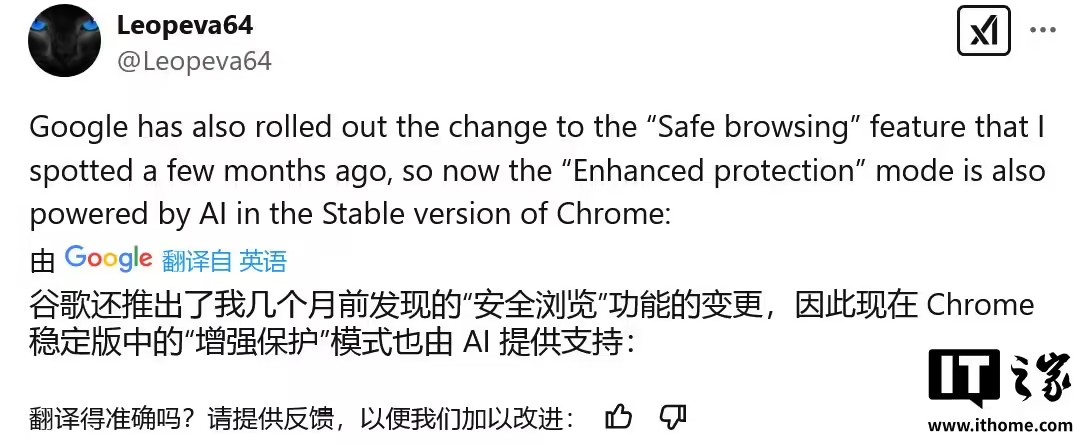 IT之家 2 月 17 日消息,消息源 @Leopeva64 昨日(2 月 16 日)在 X 平臺發(fā)布推文,稱在經過 3 個月的 Canary 頻道測試后,谷歌 Chrome 瀏覽器穩(wěn)定版已全平臺上線全新“增強保護”(Enhanced protection)功能,在現有功能基礎上,通過 AI 實時防護危險網站、下載和擴展程序等。