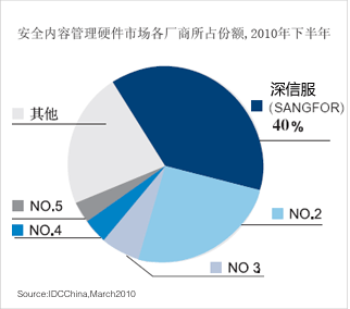 深信服科技在IDC中國(guó)發(fā)布的2009年下半年中國(guó)安全內(nèi)容管理市場(chǎng)(上網(wǎng)行為管理市場(chǎng))報(bào)告中占有率達(dá)到33.8%,超出第二位廠商達(dá)一倍多。